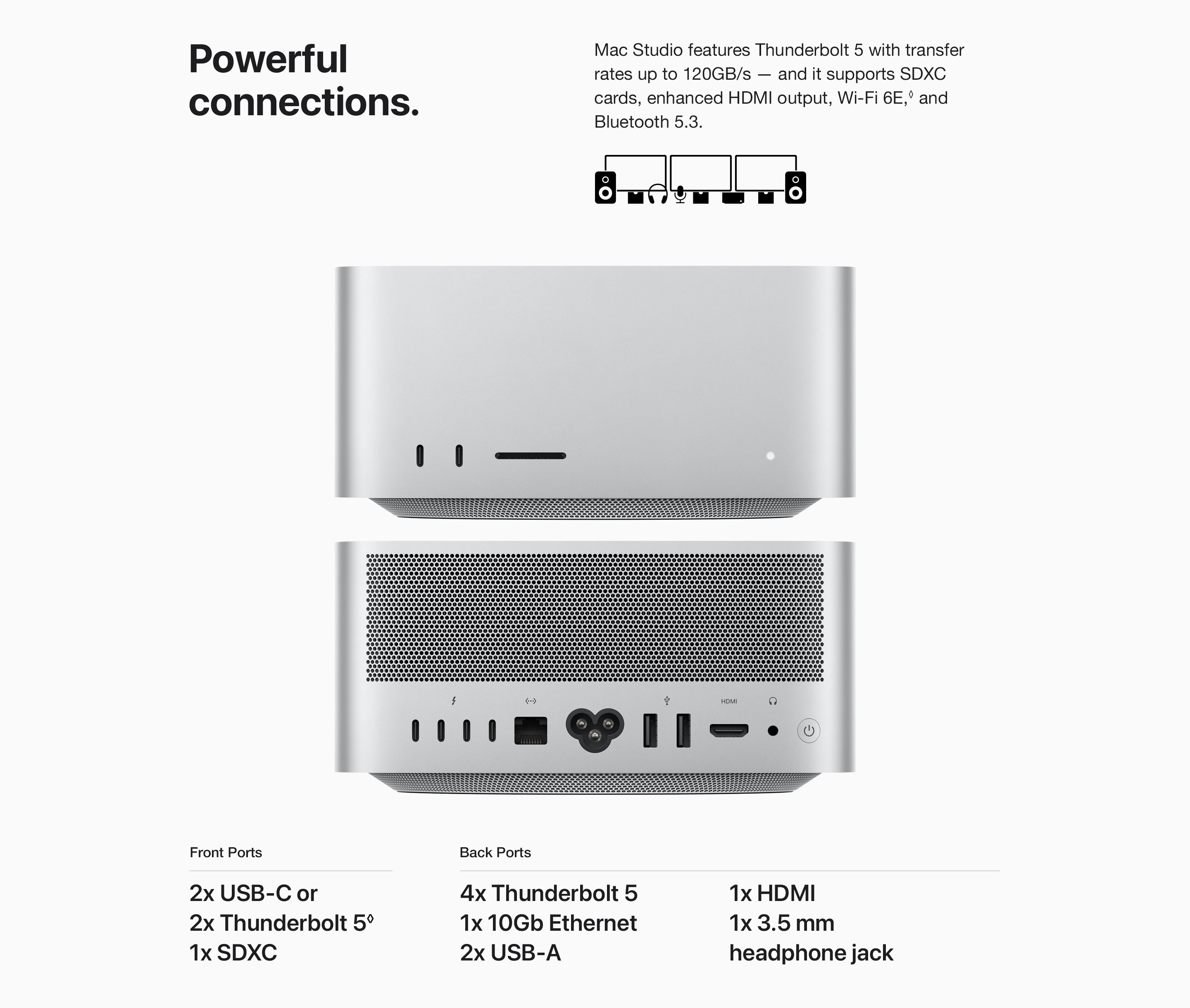 Thunderbolt 5: When configured with M3 Ultra, the two USB‑C ports support Thunderbolt 5 at up to 120Gb/s.