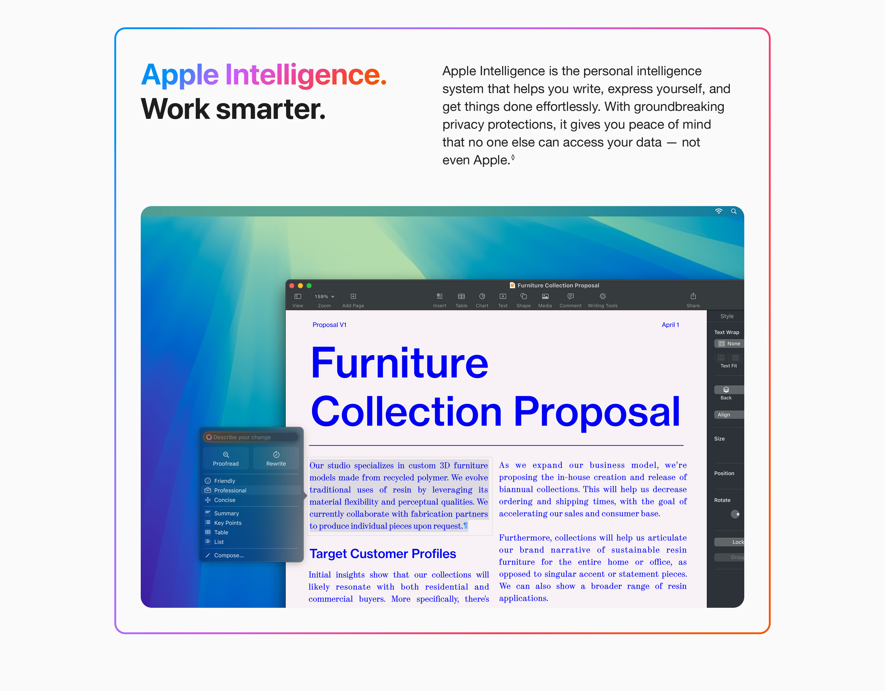 Apple Intelligence: Apple Intelligence is available in beta on all Mac models with M1 and later, with Siri and device language set to English (Australia, Canada, Ireland, New Zealand, South Africa, UK, or U.S.), as a macOS Sequoia update. Additional features and Chinese (Simplified), English (India, Singapore), French, German, Italian, Japanese, Korean, Portuguese (Brazil), and Spanish language support available in early April, with more languages coming over the course of the year, including Vietnamese. Some features may not be available in all regions or languages.