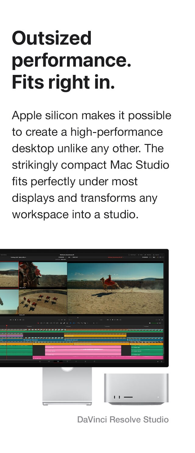 Up to 6.4x Faster GPU than 16‑core Intel‑Based Mac Pro: Testing conducted by Apple in January and February 2025 using preproduction Mac Studio systems with Apple M3 Ultra, 32‑core CPU, 80‑core GPU, and 512GB of RAM, production Mac Studio systems with Apple M2 Ultra, 24‑core CPU, 76‑core GPU, and 192GB of RAM, and production Mac Studio systems with Apple M1 Ultra, 20‑core CPU, 64‑core GPU, and 128GB of RAM, each configured with 8TB SSD, as well as production 3.2GHz 16‑core Intel Xeon W‑based Mac Pro systems with 192GB of RAM, AMD Radeon Pro W5700X graphics with 16GB of GDDR6, Afterburner, and 4TB SSD. Redshift v2025.0.2 tested using a 29.2MB scene utilizing hardware‑accelerated ray tracing on systems with M3 Ultra. Mac Studio and Mac Pro systems tested with an attached 5K display. Performance tests are conducted using specific computer systems and reflect the approximate performance of Mac Studio and Mac Pro.
