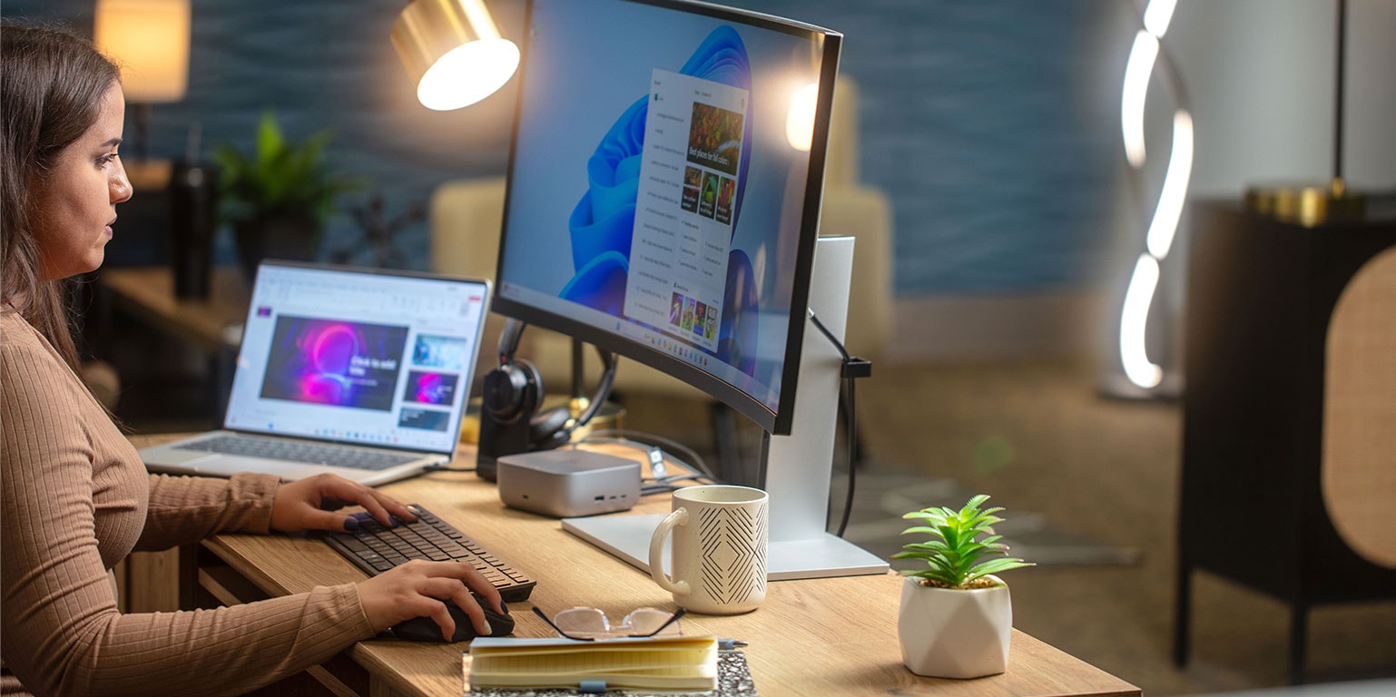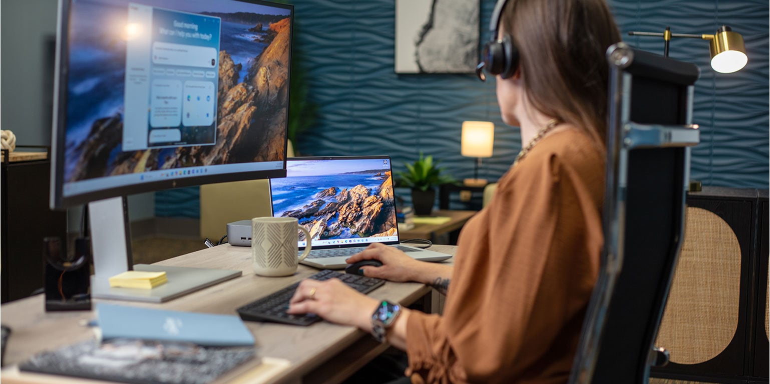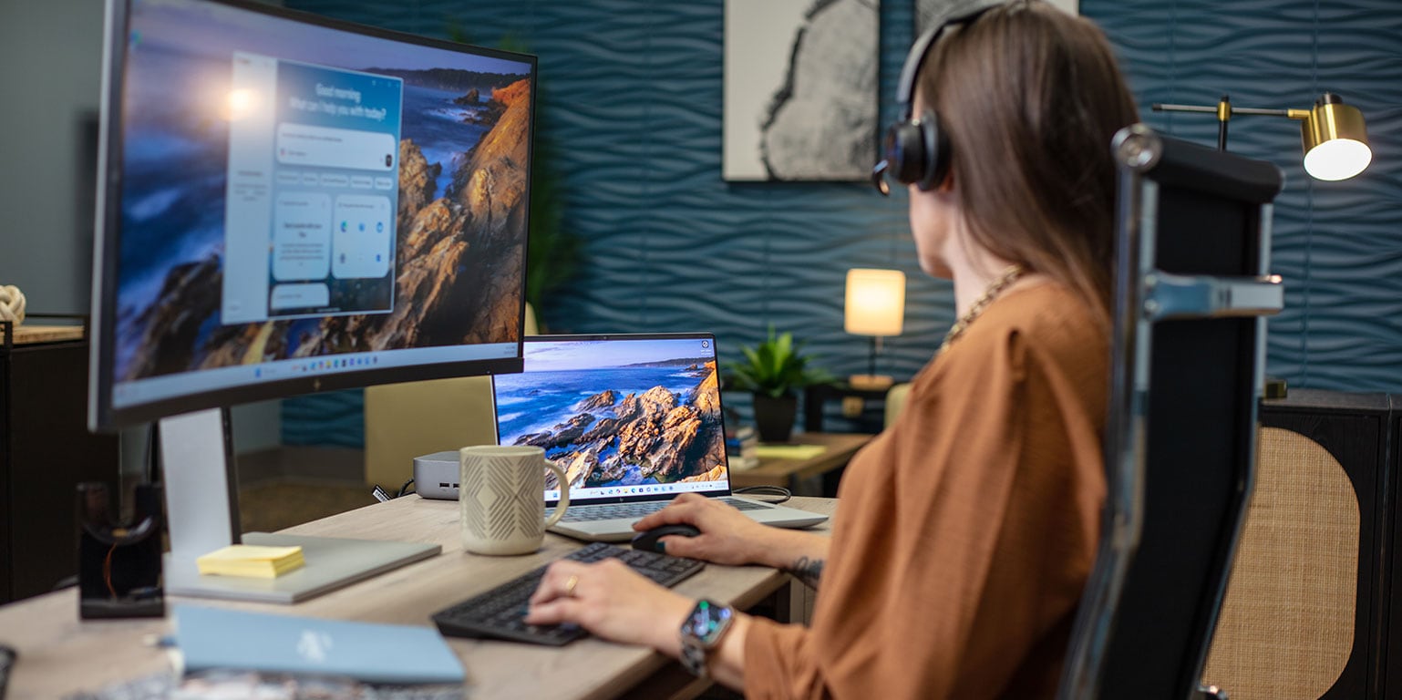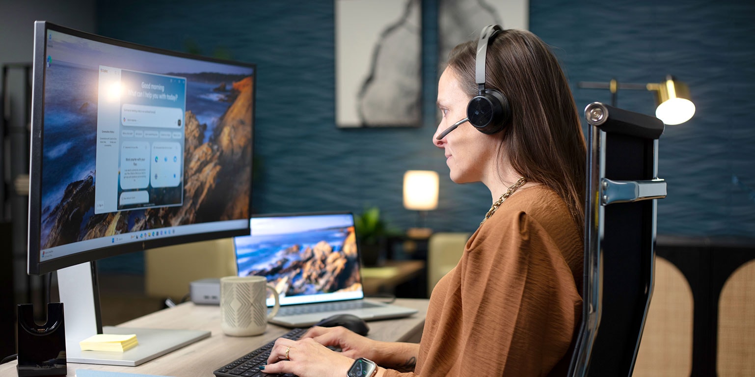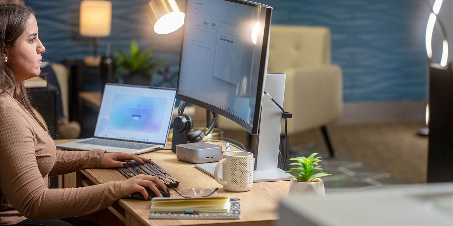 The HP 37.5" WQHD+ Series 7 Pro Curved Monitor elevates conferencing with AI. Built-in AI features include Auto Framing, Background Blur, Auto Lock and Awake, and Al Noise Reduction.