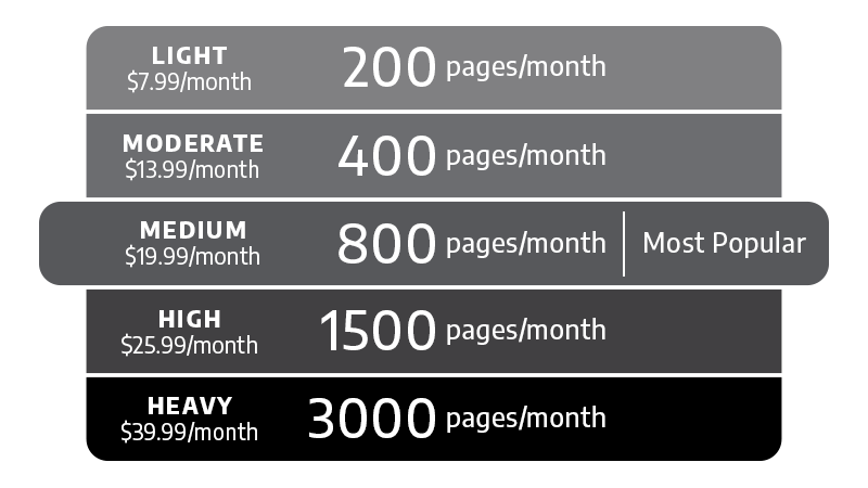 When you enroll, you’ll select a plan best suited to your needs. Your monthly fee includes toner monitoring, replacement cartridges as needed, shipping, and recycling. You can roll over unused pages or automatically purchase sets of 10–60 pages for $1.00 (pages per set varies by plan). Your plan is flexible and can be changed at any time.