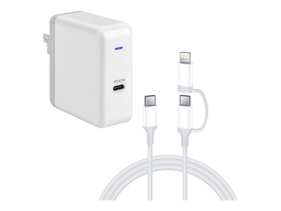 The 4XEM 45W 3FT 2-in-1 USB-C with Lightning Adapter Charging Kit delivers powerful and versatile charging for all your devices. Equipped with a USB Type-C female port and a 3ft USB-C to USB-C/Lightning cable, this charging kit is designed to support fast charging with Power Delivery (PD 3.0) and Qualcomm QC 3.0 standards. The MFi Certified Lightning connector ensures seamless compatibility with Apple devices, while the USB-C connector handles a wide range of devices, delivering up to 45W of power. The compact charger features retractable prongs, making it easy to store and carry, and includes a blue LED indicator to show when the power is on. With a durable TPE jacket and gold-plated connectors, this charging kit is built to last. The charger is lightweight and designed for maximum portability, making it an ideal companion for your travels. Perfect for home, office, or travel, the 4XEM 45W Charging Kit provides reliable performance and convenience wherever you go. Whether you're powering up your smartphone, tablet, or other USB-C compatible devices, this charging kit ensures you stay connected and charged without any hassle. Upgrade your charging experience with 4XEM, where quality meets functionality.