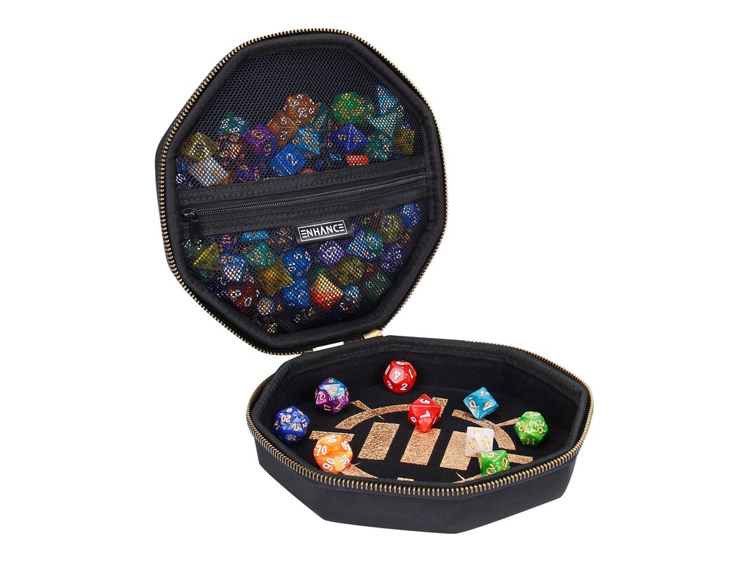 Protect and store your treasure horde of gaming dice in the ENHANCE Dice Storage Case. Beautifully designed with embossed decals and stylish bronze accents, the Dice Storage Case is the perfect addition to your collection of RPG travel accessories. The ENHANCE Dice Storage Case is actually two products in one, with one half safely storing upwards of 150 dice and the other functioning as a large dice tray that can be passed around the gaming table or held onto for personal use. A hard shell reinforced case protects your dice from wear and tear, while the soft lined interior keeps all your dice free from blemishes and unsightly scratches.