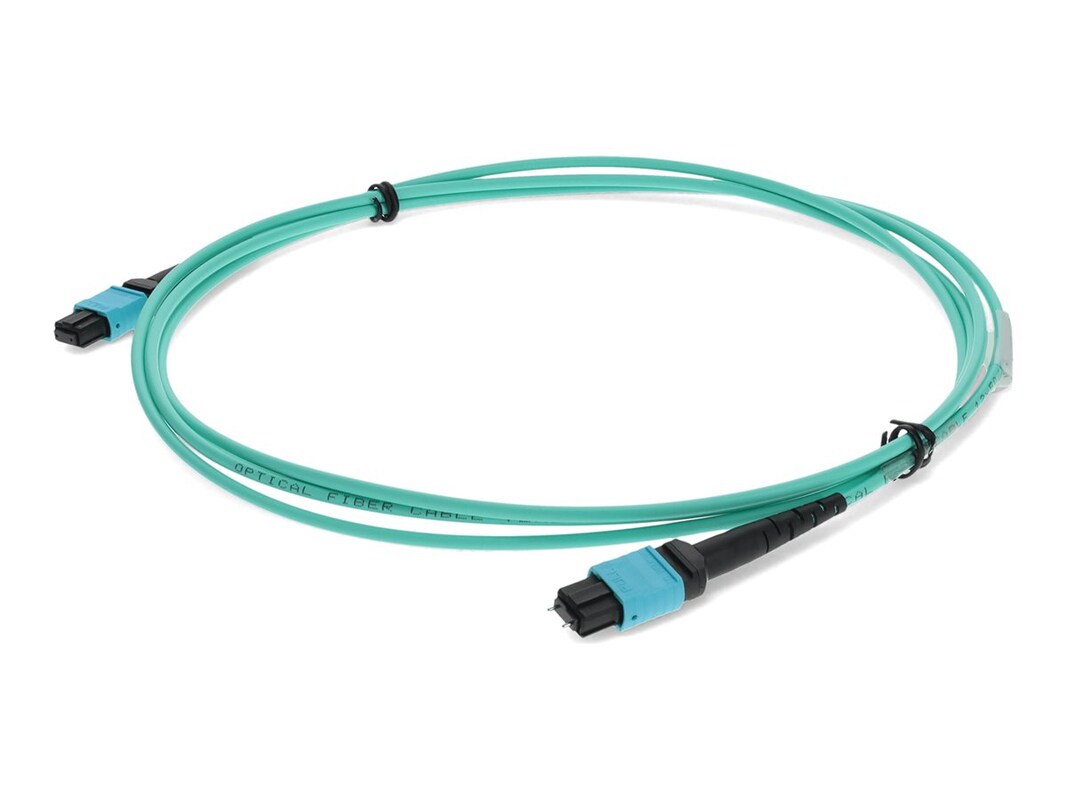 This is a MPO (male) to MPO (female) 12-strand aqua crossover duplex riser fiber patch cable. An OM4 cable has a core size of 50µm microns that supports 10 Gigabit Ethernet at lengths measuring up to 550 meters, and 100 Gigabit Ethernet measuring up to 150 meters and is reverse compatible with OM3. This optical fiber, nonconductive, riser (OFNR) cable is best suited for use in interior fiber-optic applications. A duplex cable is a two-strand fiber optic patch cable that works best with transceivers that both transmit and receive.