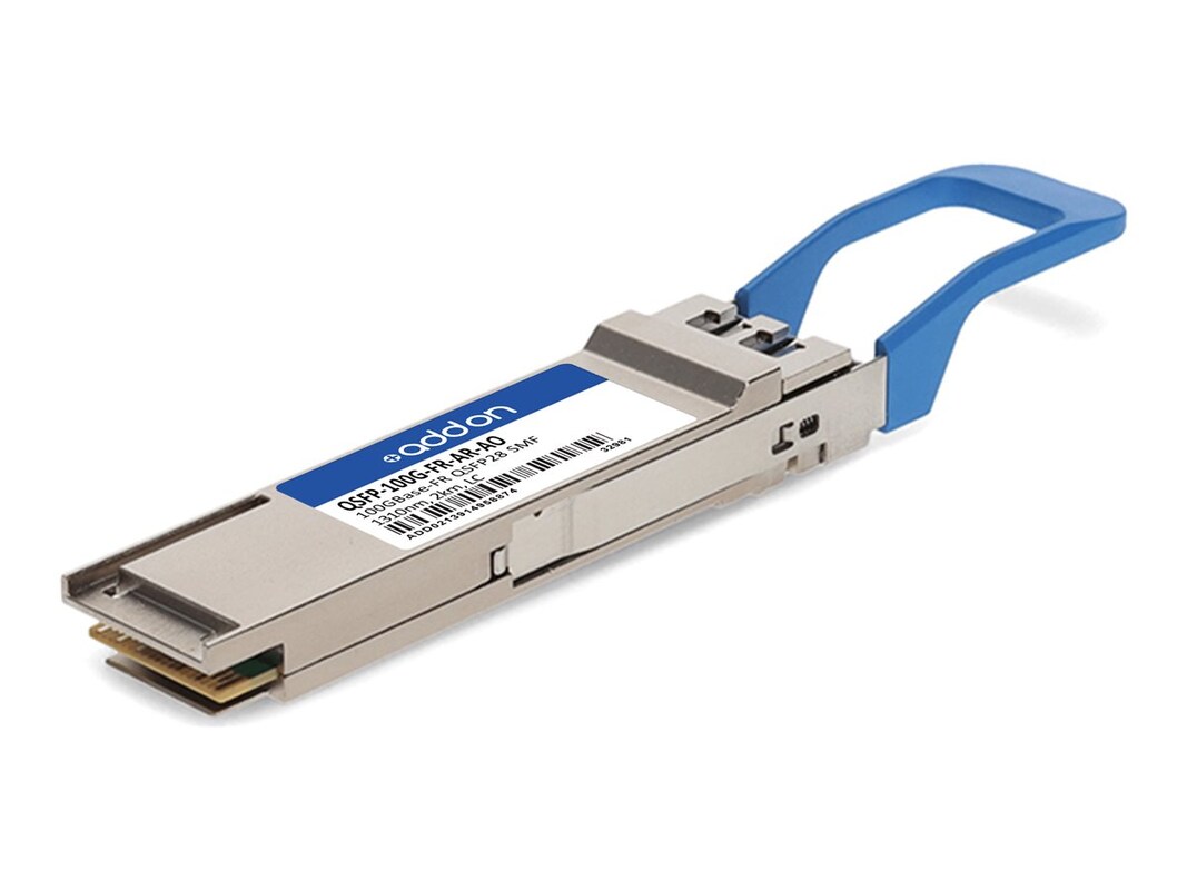 This Arista Networks QSFP-100G-FR-AR compatible QSFP28 transceiver provides 100GBase-FR throughput up to 2km over single-mode fiber (SMF) using a wavelength of 1310nm via an LC connector. It is guaranteed to be 100% compatible with the equivalent Arista Networks transceiver. This easy to install, hot swappable transceiver has been programmed, uniquely serialized and data-traffic and application tested to ensure that it will initialize and perform identically. Digital optical monitoring (DOM) support is also present to allow access to real-time operating parameters. This transceiver is Trade Agreements Act (TAA) compliant.
