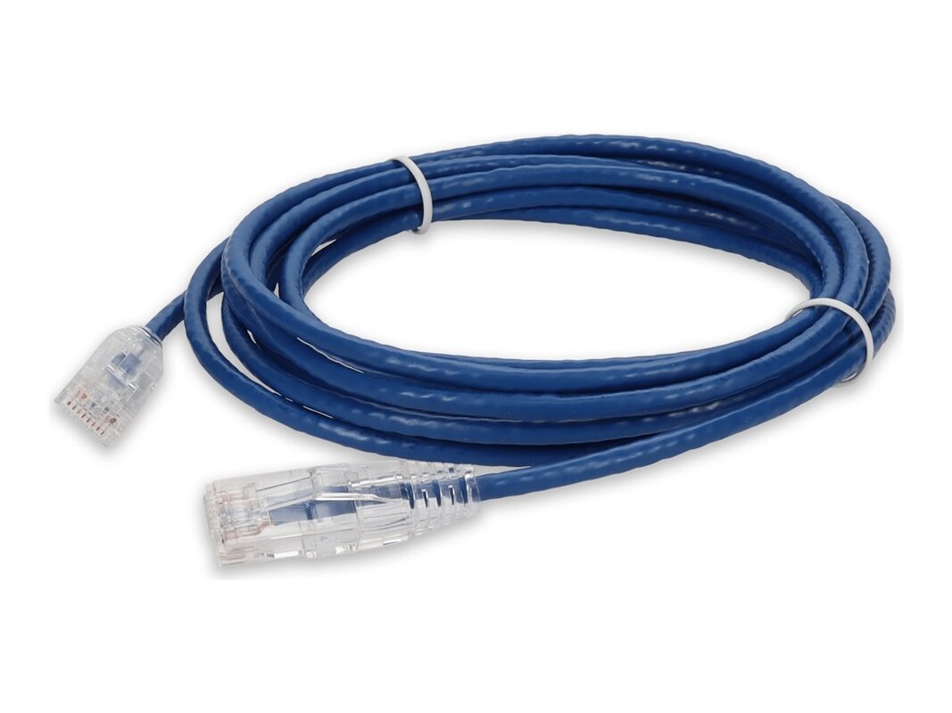 This is a RJ-45 (male) to RJ-45 (male) slim blue unshielded twisted pair PVC copper patch cable. The Cat6A cable is designed to support the high speed of EoC (Ethernet over Copper) over the full 100 meters. Cat6A cable standards provide a performance of up to 500MHz and is suitable for 100Base-TX, 1000Base-T and 10GBase-T. This PVC jacketed cable is best suited for LANs or SANs, and is recommended for connection between fiber patch panels, hubs, switches, media converters and routers. Unshielded twisted pair patch cables are perfect for data centers, LANs and other short range network connections.