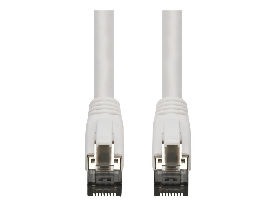 This is a RJ-45 (male) to RJ-45 (male) Cat8 UTP PVC-rated patch straight cable that is used for high speed data transfer.