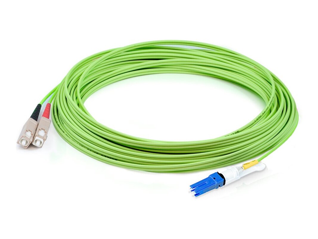 This is a CS (male) to SC (male) lime green OM5 duplex fiber OFNR (Riser-Rated) patch cable. An OM5 cable has a core size of 50m microns that supports 10 Gigabit Ethernet at lengths measuring up to 550 meters, and 100 Gigabit Ethernet measuring up to 150 meters and is reverse compatible with OM4 and OM3. This optical fiber, nonconductive, riser (OFNR) cable is best suited for use in interior fiber-optic SWDM4 applications.