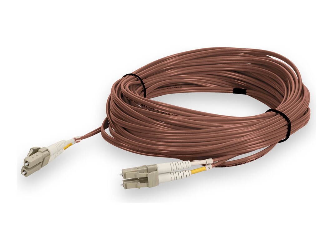 This is a LC (male) to LC (male) duplex riser-rated fiber patch cable. An OM4 cable has a core size of 50m microns that supports 10 Gigabit Ethernet at lengths measuring up to 550 meters, and 100 Gigabit Ethernet measuring up to 150 meters and is reverse compatible with OM3. This optical fiber, nonconductive, riser (OFNR) cable is best suited for use in interior fiber-optic applications. A duplex cable is a two-strand fiber optic patch cable that works best with transceivers that both transmit and receive.