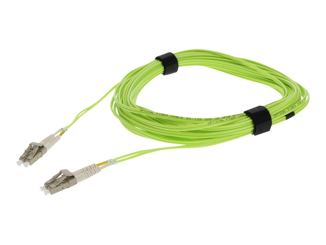 This is a LC (male) to LC (male) lime green OM5 duplex fiber OFNR (Riser-Rated) patch cable. An OM5 cable has a core size of 50m microns that supports 10 Gigabit Ethernet at lengths measuring up to 550 meters, and 100 Gigabit Ethernet measuring up to 150 meters and is reverse compatible with OM4 and OM3. This optical fiber, nonconductive, riser (OFNR) cable is best suited for use in interior fiber-optic SWDM4 applications.
