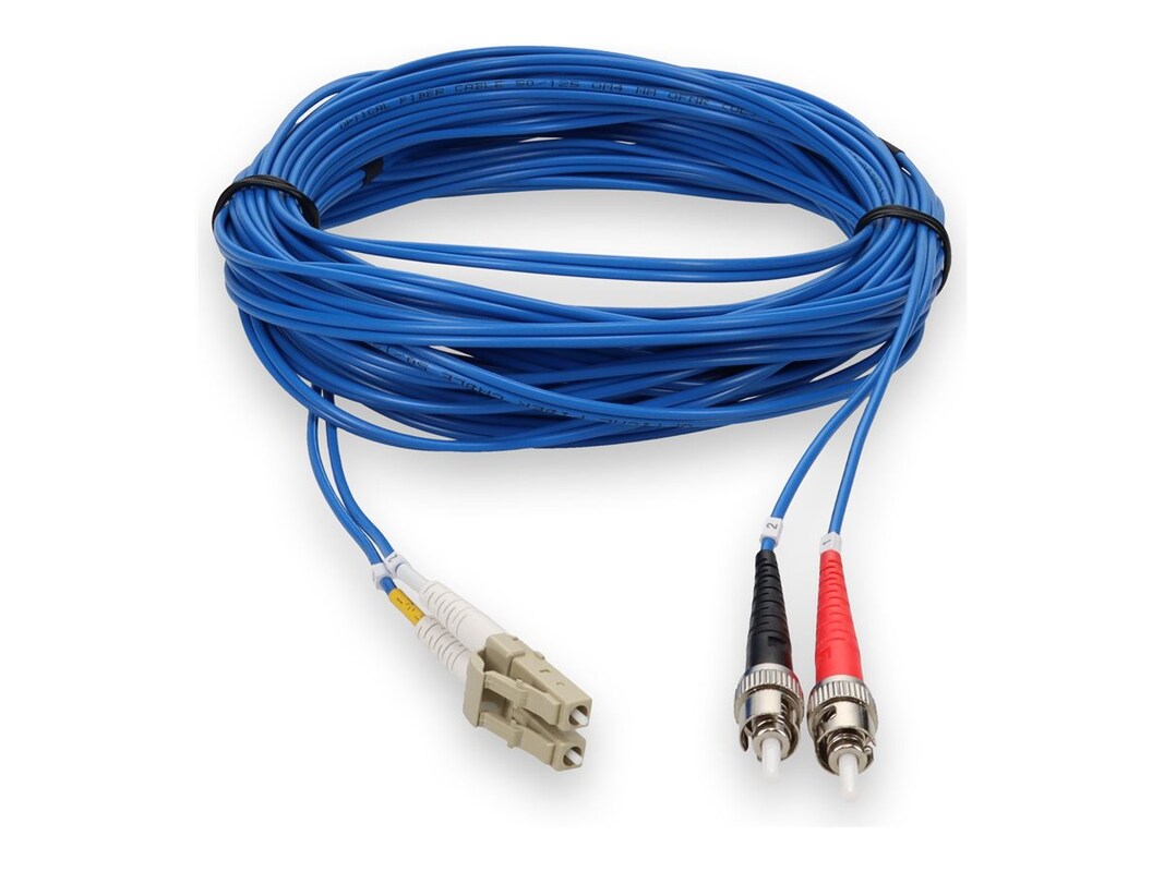 This is a LC (male) to ST (male) blue duplex riser-rated fiber patch cable. An OM4 cable has a core size of 50m microns that supports 10 Gigabit Ethernet at lengths measuring up to 550 meters, and 100 Gigabit Ethernet measuring up to 150 meters and is reverse compatible with OM3. This optical fiber, nonconductive, riser (OFNR) cable is best suited for use in interior fiber-optic applications. A duplex cable is a two-strand fiber optic patch cable that works best with transceivers that both transmit and receive.