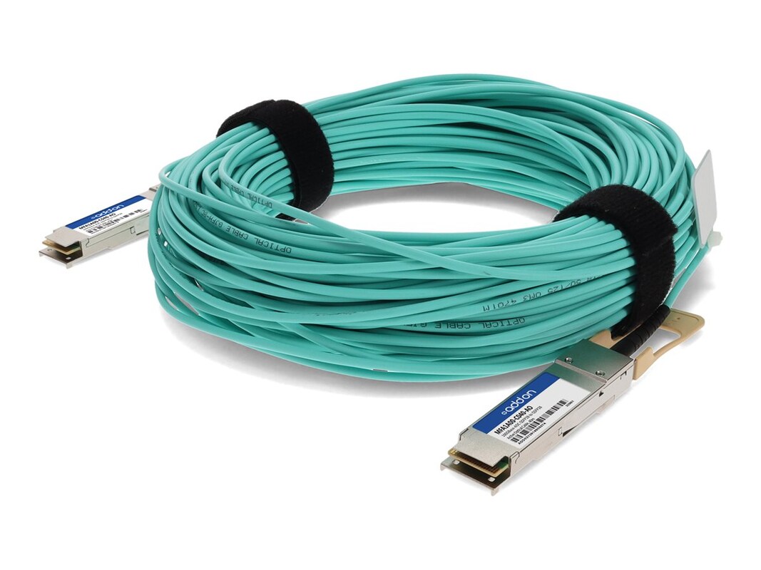 This is a Mellanox compatible 100GBase-AOC QSFP28 active optical cable that operates over multi-mode fiber. At a wavelength of 850nm, it has been programmed, uniquely serialized, and data-traffic and application tested to ensure it is 100% compliant and functional. This active optical cable is TAA (Trade Agreements Act) compliant, and is built to comply with MSA (Multi-Source Agreement) standards.