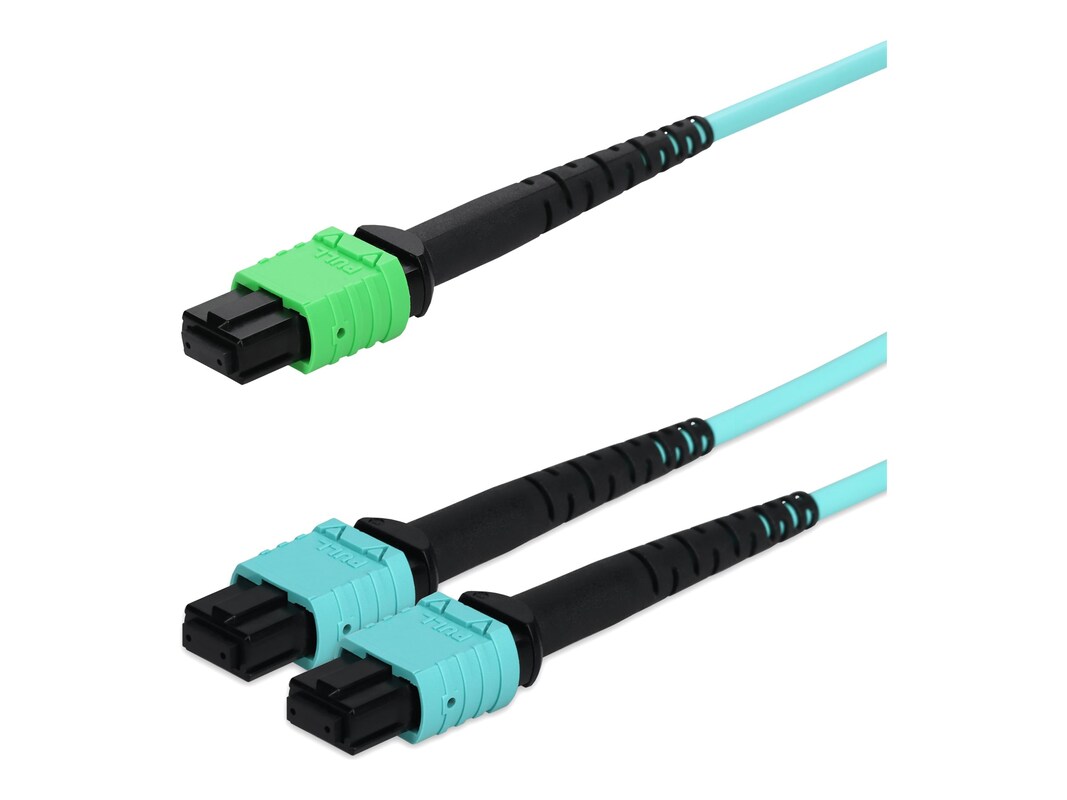 AddOn MPO-16 (APC) to 2xMPO F F 16-strand OM4 Crossover OFNR (Riser-Rated) Fiber Fanout Cable, Aqua, 5m