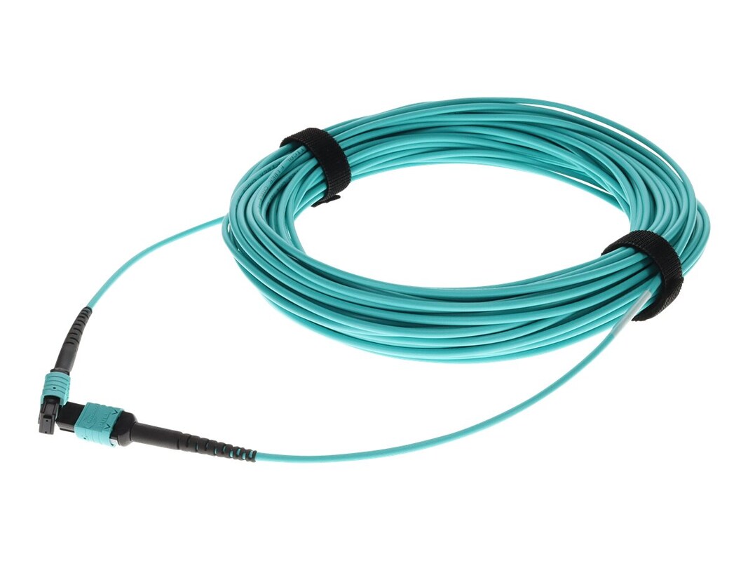 This is a MPO (female) to MPO (female) 12-strand aqua crossover plenum-rated fiber patch cable. An OM4 cable has a core size of 50µm microns that supports 10 Gigabit Ethernet at lengths measuring up to 550 meters, and 100 Gigabit Ethernet measuring up to 150 meters and is reverse compatible with OM3. This optical fiber, nonconductive, plenum (OFNP) cable is best suited for use in interior fiber-optic applications.