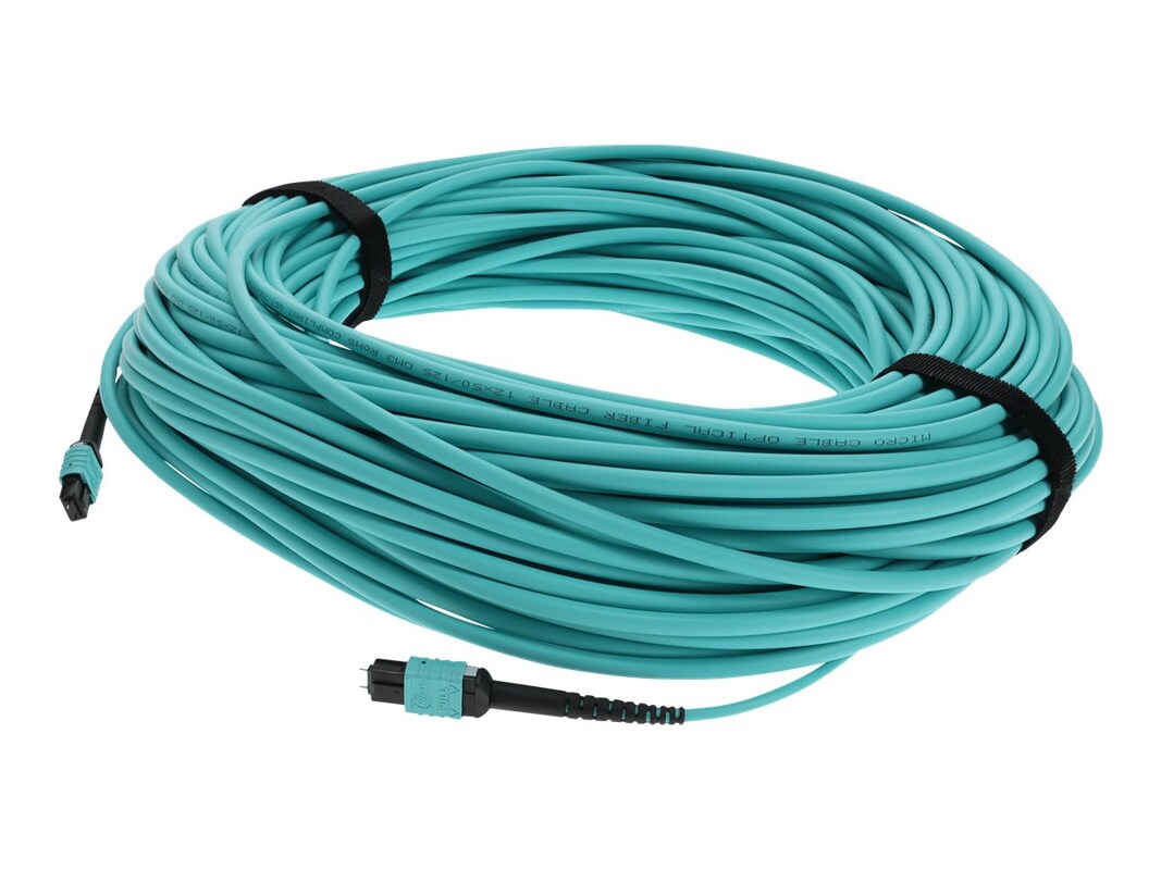 This is a 15m MPO (male) to MPO (male) 12-strand aqua straight riser-rated fiber patch cable. An OM3 cable has a core size of 50 microns that supports 10 Gigabit Ethernet at lengths measuring up to 300 meters, and 40 Gigabit or 100 Gigabit Ethernet measuring up to 100 meters. This optical fiber, nonconductive, riser (OFNR) cable is best suited for use in interior fiber-optic applications. Our patch cables are 100% compliant for all of your networking needs. Our products are guaranteed by federal law to not affect or void OEM warranties.