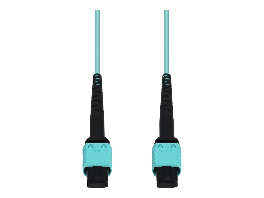 This is a MPO/UPC to MPO/UPC Aqua OM4 Duplex OFNP (Plenum-Rated) 12-Strand Fiber Patch Cable. OM4 fiber optic cable is a high-performance multimode fiber optimized for high-speed data transmission, supporting up to 100G over distances of up to 150 meters. Ideal for data centers and large-scale network infrastructures, it delivers superior bandwidth and reliability for demanding business applications. OFNP plenum fiber cable jackets are engineered for use in air-handling spaces, such as ceilings and ducts, offering the highest fire resistance to prevent flame spread and reduce smoke in the event of a fire. These cables meet stringent safety standards, making them the top choice for businesses that need safe, reliable networking in critical building areas. The Standard Boot option provides reliable and straightforward connections for fiber cables, making it an economical choice for various networking applications.
