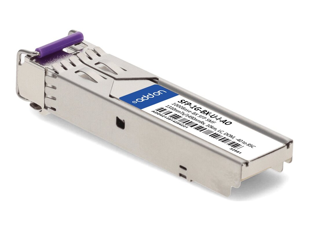 This MSA compliant SFP transceiver provides 1000Base-BX throughput up to 10km over single-mode fiber (SMF) using a wavelength of 1310nmTx/1490nmRx via an LC connector. This bidirectional unit must be used with another transceiver or network appliance of complementing wavelengths. It is capable of withstanding rugged environments and can operate at temperatures between -40 and 85C. All of our transceivers are built to comply with Multi-Source Agreement (MSA) standards and are uniquely serialized and tested for data-traffic and application to ensure seamless network integration. Additional product features include Digital Optical Monitoring (DOM) support which allows access to real-time operating parameters. This transceiver is Trade Agreements Act (TAA) compliant.