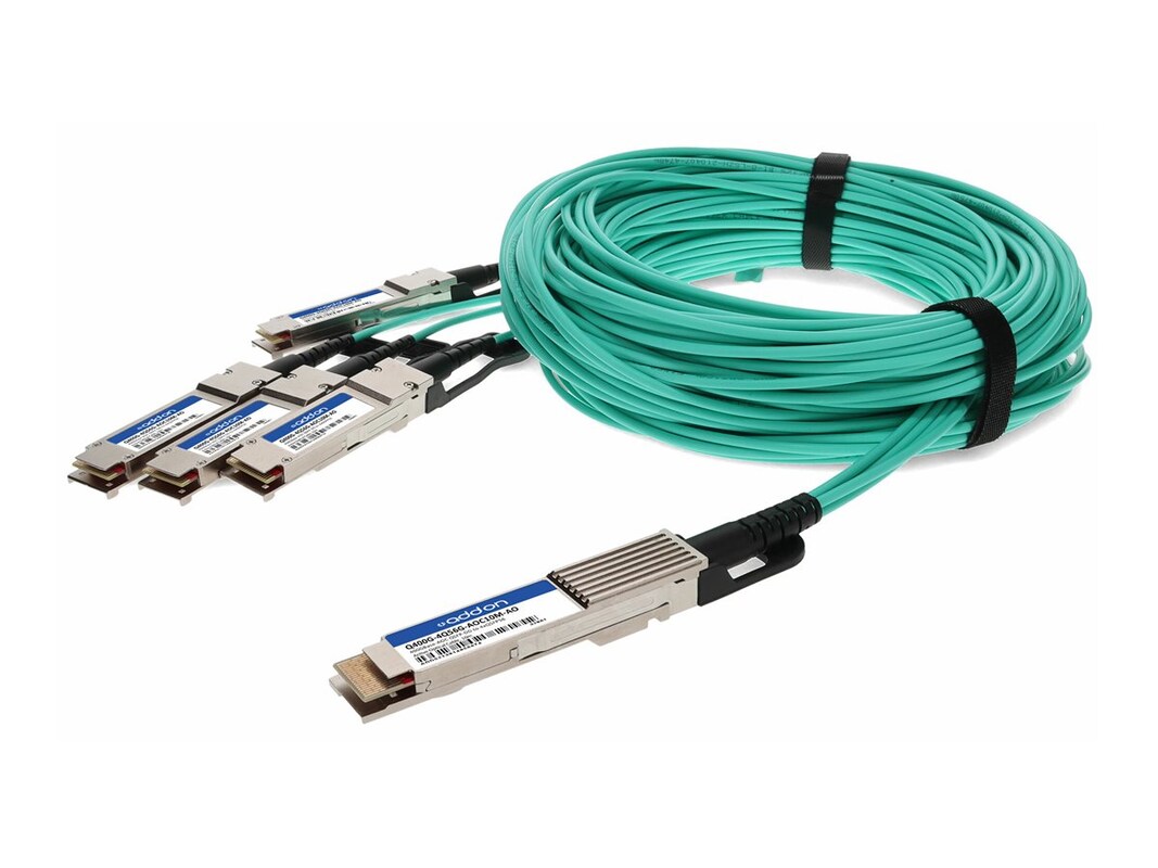 This is an MSA and TAA compliant 400GBase-AOC QSFP-DD to 4xQSFP56 active optical cable that operates over multi-mode fiber. At a wavelength of 850nm, it has been programmed, uniquely serialized, and data-traffic and application tested to ensure it is 100% compliant and functional. This active optical cable is TAA (Trade Agreements Act) compliant, and is built to comply with MSA (Multi-Source Agreement) standards.