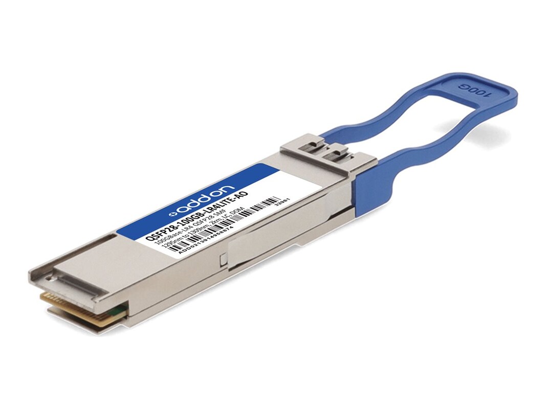 This MSA Compliant QSFP28 transceiver provides 100GBase-LR4 throughput up to 2km over FALSE using a LC connector. It is built to MSA standards and is uniquely serialized and data-traffic and application tested to ensure that they will integrate into your network seamlessly. Digital optical monitoring (DOM) support is also present to allow access to real-time operating parameters. All of our transceivers are Trade Agreements Act (TAA) compliant. We stand behind the quality of our products and proudly offer a limited lifetime warranty.