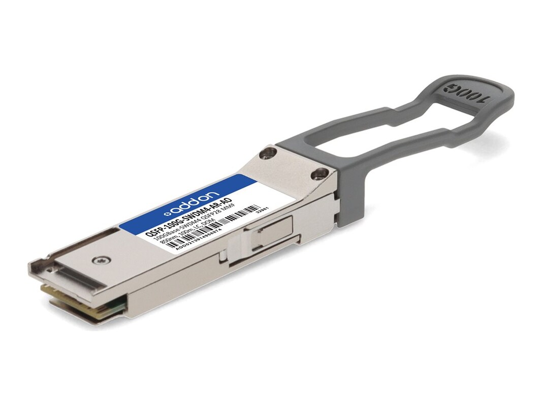 This Arista Networks compatible QSFP28 transceiver provides 100GBase-SWDM4 throughput up to 100m over OM4 multi-mode fiber (MMF) using a wavelength of 850nm via an LC connector. It is guaranteed to be 100% compatible with the equivalent Arista Networks transceiver. This easy to install, hot swappable transceiver has been programmed, uniquely serialized and data-traffic and application tested to ensure that it will initialize and perform identically. Digital optical monitoring (DOM) support is also present to allow access to real-time operating parameters.