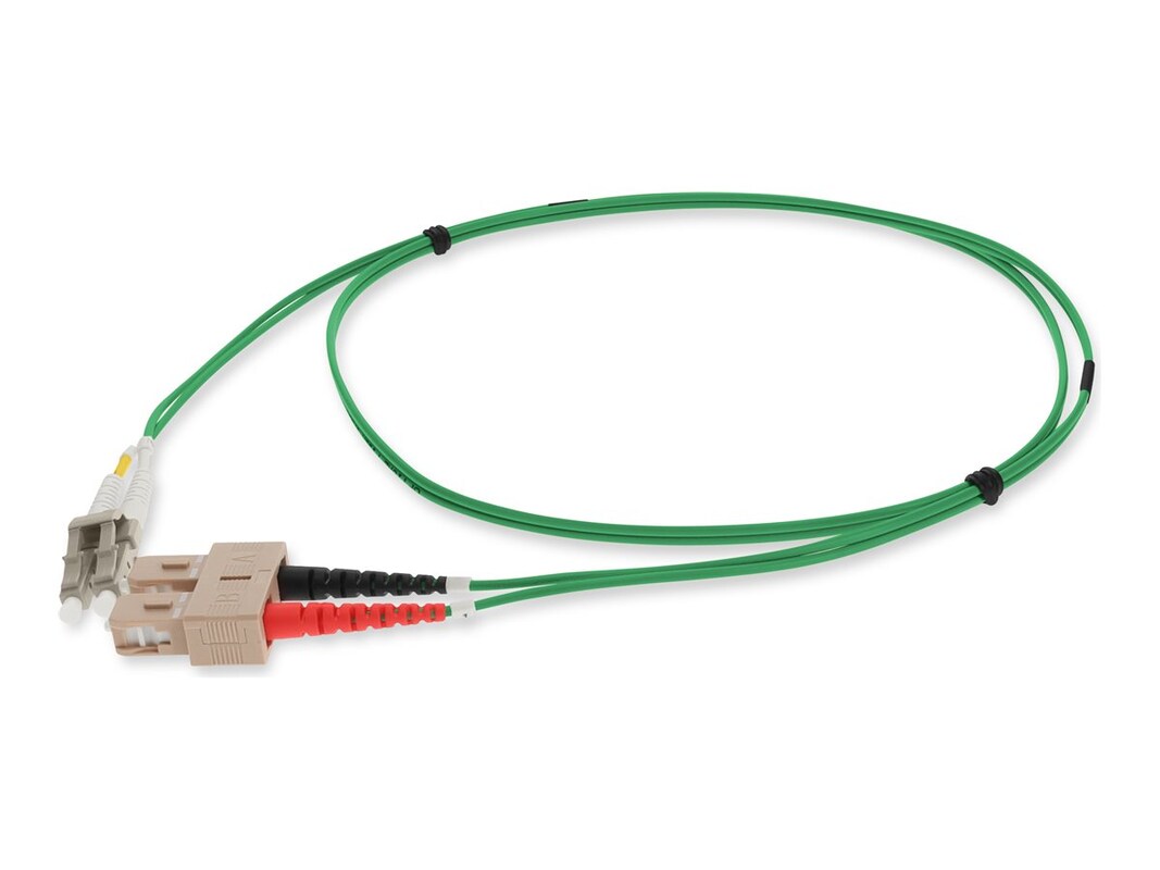 This is a LC (male) to SC (male) green OM4 duplex plenum-rated patch straight cable that is used for high speed data transfer. An OM4 cable has a core size of 50m microns that supports 10 Gigabit Ethernet at lengths measuring up to 550 meters , and 100 Gigabit Ethernet measuring up to 150 meters and is reverse compatible with OM3. Plenum-rated cables must self-extinguish and prevent re-ignition. Duplex cabling provides two-strands of fiber and is most commonly used in applications that utilize one lane to transmit and one lane to receive.