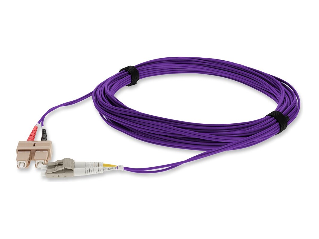 This is a LC (male) to SC (male) duplex riser-rated fiber patch cable. An OM4 cable has a core size of 50µm microns that supports 10 Gigabit Ethernet at lengths measuring up to 550 meters, and 100 Gigabit Ethernet measuring up to 150 meters and is reverse compatible with OM3. This optical fiber, nonconductive, riser (OFNR) cable is best suited for use in interior fiber-optic applications. A duplex cable is a two-strand fiber optic patch cable that works best with transceivers that both transmit and receive.
