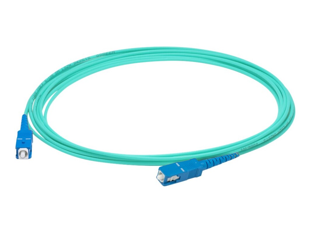 This is a SC to SC Aqua OM4 Simplex OFNR (Riser-Rated) Fiber Patch Cable. OM4 fiber optic cable is a high-performance multimode fiber optimized for high-speed data transmission, supporting up to 100G over distances of up to 150 meters. Ideal for data centers and large-scale network infrastructures, it delivers superior bandwidth and reliability for demanding business applications. OFNR riser fiber cable jackets are designed for vertical installations in building risers, providing fire-resistant protection to ensure safe data transmission between floors. These cables meet strict safety standards, making them ideal for businesses that need reliable, in-building network infrastructure without the risk of fire spreading through conduits. The Standard Boot option provides reliable and straightforward connections for fiber cables, making it an economical choice for various networking applications.