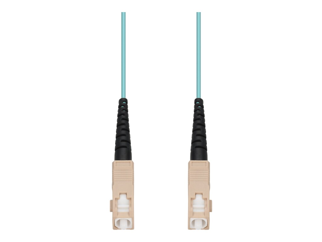 This is a SC to SC Aqua OM4 Simplex OFNR (Riser-Rated) Fiber Patch Cable. OM4 fiber optic cable is a high-performance multimode fiber optimized for high-speed data transmission, supporting up to 100G over distances of up to 150 meters. Ideal for data centers and large-scale network infrastructures, it delivers superior bandwidth and reliability for demanding business applications. OFNR riser fiber cable jackets are designed for vertical installations in building risers, providing fire-resistant protection to ensure safe data transmission between floors. These cables meet strict safety standards, making them ideal for businesses that need reliable, in-building network infrastructure without the risk of fire spreading through conduits. The Standard Boot option provides reliable and straightforward connections for fiber cables, making it an economical choice for various networking applications.
