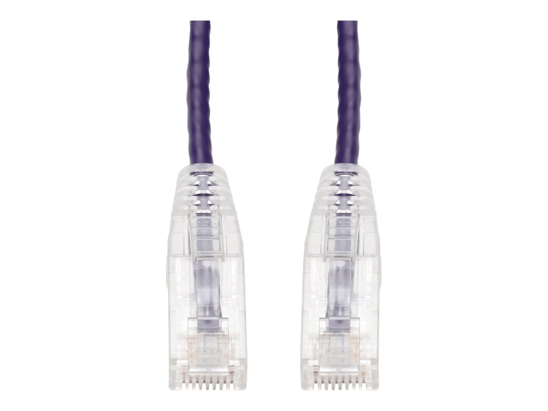 This is a RJ-45 (male) to RJ-45 (male) purple Cat6A Slim UTP PVC-rated patch straight cable that is used for high speed data transfer.