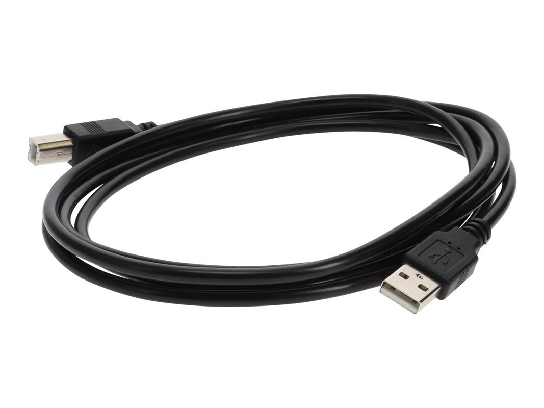 This USB extension cable features one male USB Type A connector and one male USB Type B connector.