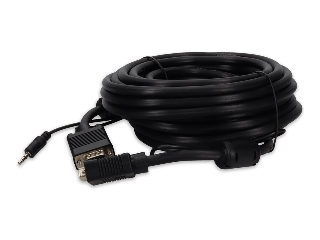 This audio/video high resolution monitor cable features two HDDB15 VGA male connectors and two 3.5mm male connectors.