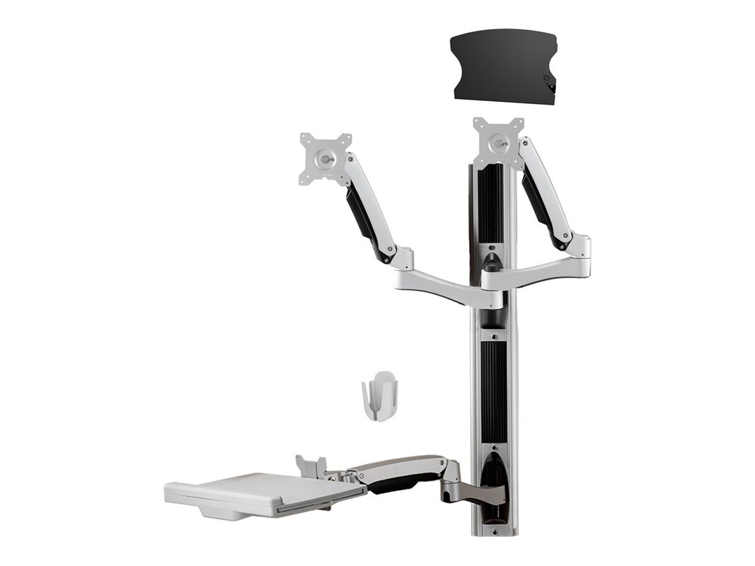 The Amer Mounts AMR2AWSV3 mounting kit offers a versatile workstation solution designed to accommodate two LCD displays, a keyboard, mouse, and CPU for a complete setup. With a modern design and a variety of materials including plastic, aluminum, rubber, and steel, this mounting kit secures displays effectively while enhancing the overall aesthetic of the workspace. The dual sit-stand configuration with an extended arm allows for easy adjustments, giving users the ability to customize their viewing experience. Featuring integrated cable management, it helps maintain a tidy workspace while supporting displays up to 32 inches in size, ensuring functionality and organization are prioritized in any environment.