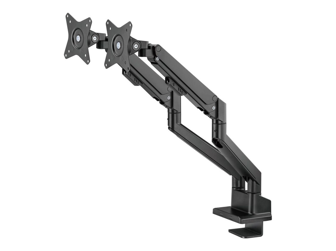 The Amer Mounts HYDRA2GB mounting kit combines functionality with sleek aesthetics. Designed for the modern professional, this desk-mountable kit supports two flat panels, allowing for an optimized workspace that enhances productivity and multitasking. With features like 180° rotation, 45° tilt, and swivel capabilities, users can easily adjust their displays to the perfect viewing angle, reducing strain and increasing comfort during long work sessions. The HYDRA2GB also boasts a robust construction of aluminum, plastic, and steel, ensuring durability and stability for displays ranging from 17" to 32". Additionally, its integrated cable management system and matte powder-coated finish not only enhance the overall look of the workspace but also keep it free from clutter. Whether for professional or personal use, the HYDRA2GB mounting kit offers a comprehensive solution for anyone looking to improve their display setup.