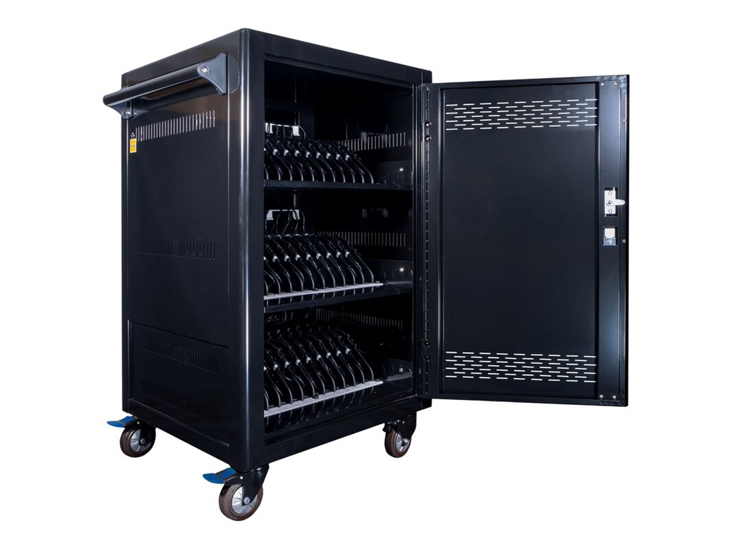 Equipped with four wheels featuring a diameter of 10.2 cm and a locking mechanism that includes a three-point locking system with a padlock, the PT-36 promotes both mobility and security. Additionally, integrated cable management and clips help to keep cords organized, enhancing the overall user experience. The cart also features removable AC adapter baskets and device dividers, allowing for customized storage solutions.