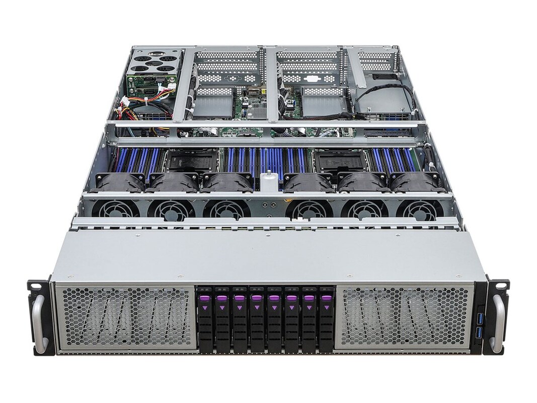 The ASRock Rack 2U4G8E-EGS2 is designed for efficient rack-mountable server solutions with a robust chassis equipped with a built-in LED panel and 6 x 60 mm fans for optimal cooling. It offers flexibility with 10 hot-swap bays that support both SATA and NVMe drives in 2.5" and 3.5" form factors, ensuring easy maintenance and upgrades. This server's architecture allows for scalability with a dual LGA4677 processor socket configuration, accommodating up to 2 processors, while supporting up to 16 DIMM slots for DDR5 SDRAM. Networking capabilities include dual Gigabit Ethernet ports, providing dependable connections for data transfer. Power efficiency is a key feature, supported by a dual 2700-watt power supply with 80 PLUS Platinum certification, offering high reliability and power redundancy. The ASRock Rack 2U4G8E-EGS2 is a choice for businesses seeking a reliable and adaptable server solution, with an extensive range of expansion options to meet various operational needs.
