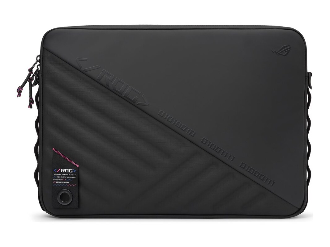 The ASUS ROG SLASH Sleeve 4.0 is designed to provide style and protection for your notebook. With a sleek design made from durable polyester and vegan leather, this carrying case ensures your device remains safe from scratches and damage. It features a water-repellent construction, offering peace of mind during your travels, whether encountering unexpected rain or spills. The adjustable shoulder strap allows for comfortable transportation, making it easy to take your essentials on-the-go. Included in the package are an ROG sticker and a dust bag, enhancing the ownership experience while keeping your gear organized.