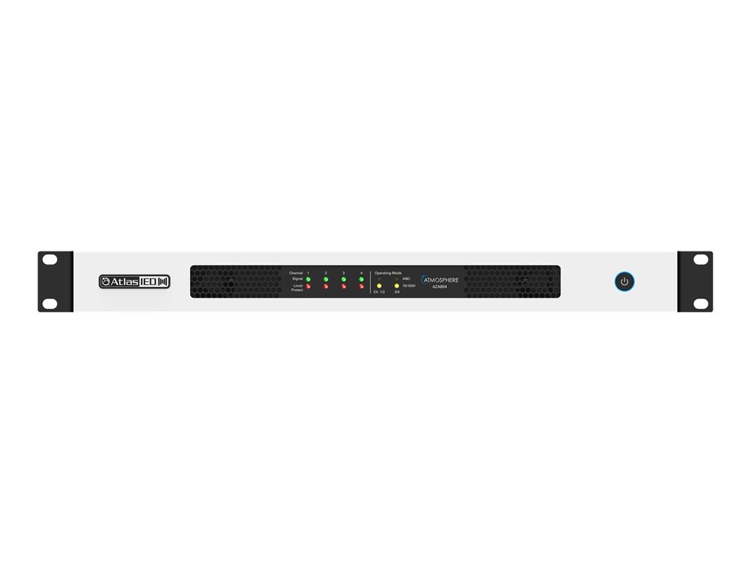 The AtlasIED Atmosphere AZA804 four-channel amplifier is designed to interface with the Atmosphere family of products, such as the AZM series of processors. The AZA amplifiers can be configured in three different configurations to meet the design requirements of any installation. These AZA models are factory preconfigured in a four-channel, 70 V mode. If the design requires four channels of low impedance amplification, the AZA amplifiers can be configured as four-channel models with either 4O or 8O load impedances. Many system designs require both low and high impedance amplification.