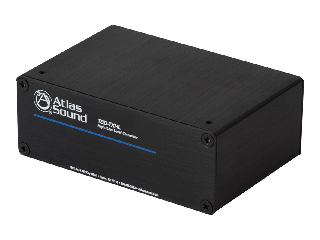 The TSD-TXHL is a high to low level converter designed to interface with distributed loudspeaker lines. An unbalanced line level output is provided to drive remote amplifiers or other devices. The TSD-TXHL allows easy expansion of zones without the need for dedicated wiring to remote locations. The high to low-level converter features an isolated transformer, which will not add measurable load to the loudspeaker line.