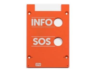The 2N IP Safety control panel faceplate by Axis Communications features a clear and functional design, making it an essential component for safety communication. The faceplate is equipped with two prominent buttons labeled 'INFO' and 'SOS', ensuring that users can easily identify and access emergency features. This panel is designed to withstand demanding environments, providing peace of mind in critical situations. The straightforward interface allows for efficient operation, suitable for various applications where safety is a priority.