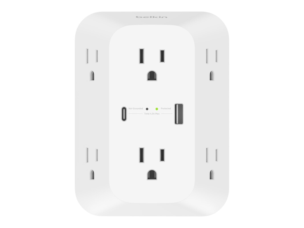 Our compact wall charger safely and efficiently charges up to eight devices at once with six AC outlets,