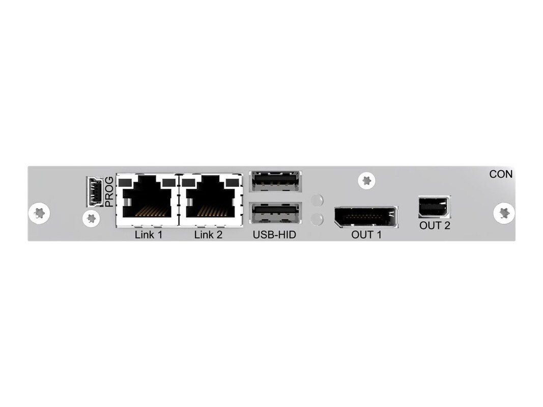 Dual-Head DP and USB HID extender module for DKM Modular KVM Extender Housing Chassis The DKM FX Modular KVM Extender Interface Card extends visually lossless high-resolution DisplayPort signals over CATx cable. It also features two USB HID ports so you can easily connect your keyboards mice and other devices. You can use the extender card with the DKM FX Chassis for matrix switching or as a point-to-point KVM extender. The DKM FX Extender Card supports 4K resolutions (4096 x 2160 and 3840 x 2160) in single-head mode and up to 1920 x 1200 video in dual-head mode. Audio is directly reproduced by any connected displays with integrated speakers. The stereo signal can also be extracted and output separately.