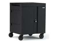 Constructed from durable steel, the cart features two lockable doors and two shelves that provide secure storage. The cable management system ensures a tidy setup, preventing tangled cords and facilitating easy access. Designed for mobility, this cart is equipped with four wheels, each with brakes for added stability, making it easy to move between locations as needed. The included power cord and padlock contribute to the complete package, offering peace of mind and convenience.