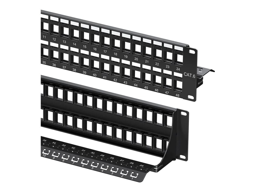 The Cable Matters patch panel offers a reliable organization solution for cabling with its 48 ports designed for keystone type connections. Constructed from heavy-duty stainless steel, this panel ensures durability and stability in any rack-mountable setup. With a flame-retardant feature, it adds an extra layer of safety while accommodating effective cable management to keep your installation neat and accessible.