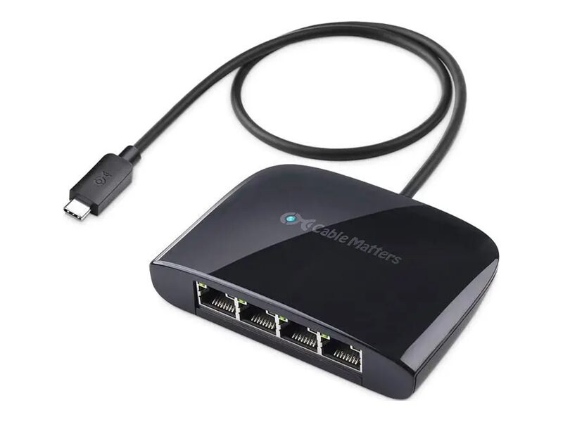The Cable Matters USB-C Network Adapter offers reliable and efficient connectivity for various devices. With its integrated 51 cm USB-C cable, this adapter features four RJ-45 ports, enabling multiple wired connections through Ethernet. It supports data transfer rates of up to 1 Gbps, ensuring quick and seamless network performance for both home and office use. The external form factor provides ease of use and portability, making it an ideal choice for users on the go. Experience robust networking capabilities with Wake On LAN (WOL) and full duplex mode features, allowing for enhanced functionality and improved communication. This adapter is designed to cater to various Ethernet standards, providing users with the flexibility they need in a networked environment.