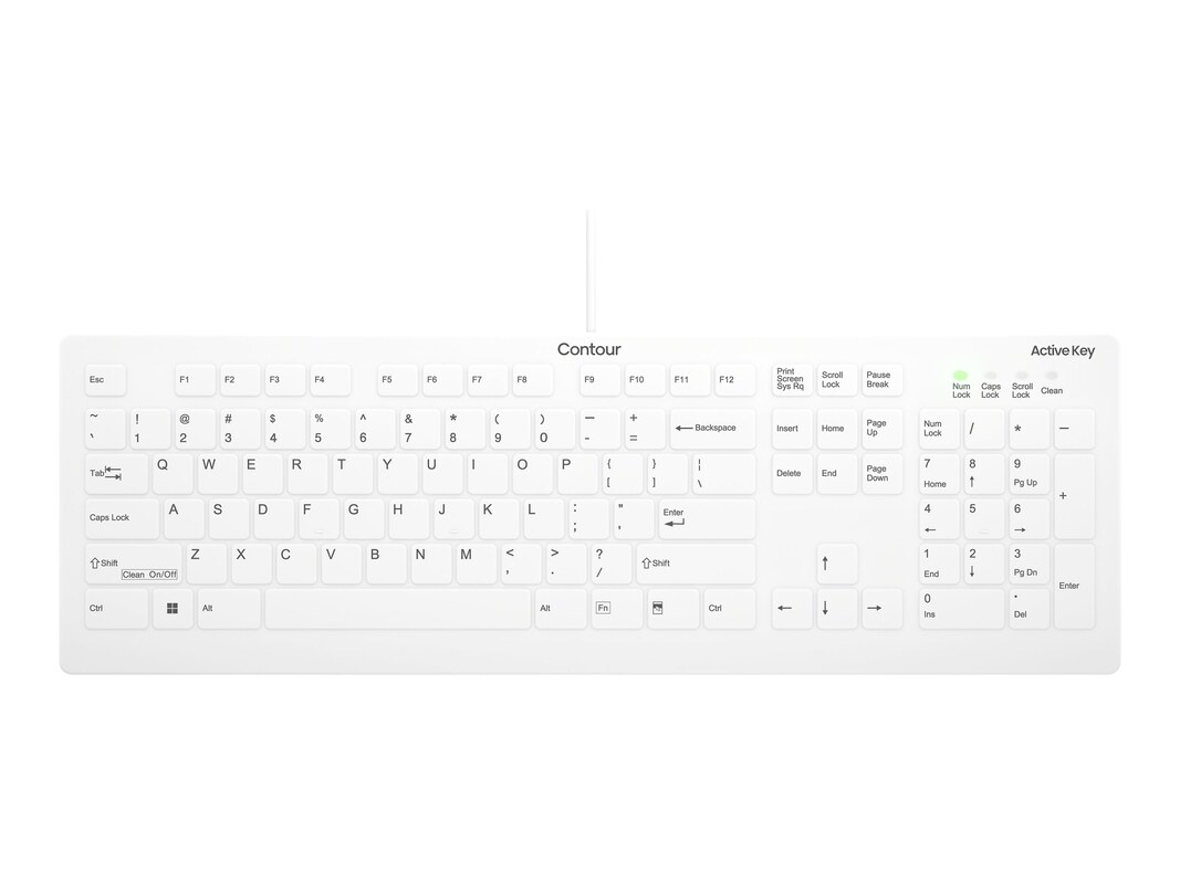 The Contour Active Key AK-C8112 keyboard is a reliable and durable accessory for any PC user seeking performance. With its 105 keys featuring a scissors style, users can enjoy comfortable and quiet typing, suitable for both office and home environments. The inclusion of a numeric keypad enhances productivity, especially in tasks that require frequent number input. Unique to this model is the clean on/off key function, allowing for easy cleaning and maintenance, crucial for environments where hygiene is a priority. Constructed with ABS keycaps and a silicone base, the AK-C8112 is built to last and withstand daily use. It also meets a variety of compliance standards, ensuring it meets high safety and quality requirements. Whether for professional or personal use, the Contour Active Key AK-C8112 keyboard combines functionality with user-friendly features.