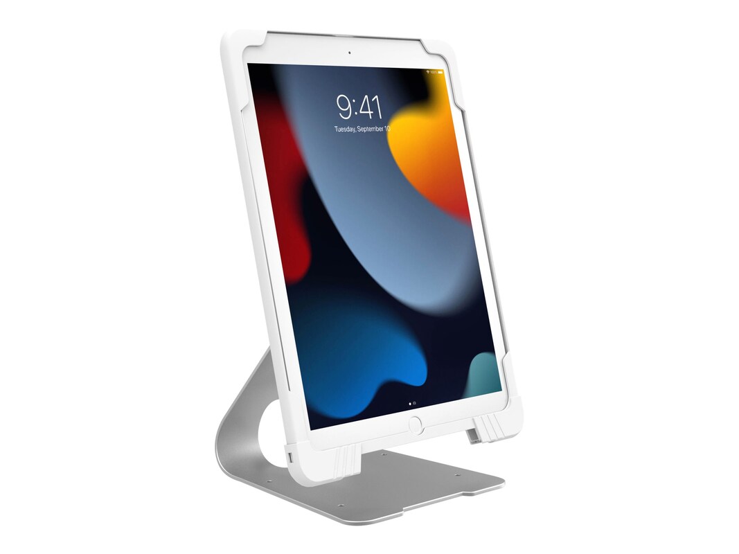 Keep your tablet protected and secured with CTA Digital's Anti-Theft Security Case with Stand for iPad. This is an ideal security enclosure and stand solution for display, point of sale, or personal use. The slim but strong case is adaptable – and can fit an array of Apple devices including iPad 5th-9th Gen, iPad Air 1-3 & iPad Pro 9.7" and 10.5". The enclosure is designed with full access to all ports and buttons. To use, extend the adjustable arms and slide tablet between bottom brackets to the top of the enclosure. If using smaller tablets, insert the L-shaped adapter into the left side of the enclosure. Then, tighten arm brackets to snugly hold the tablet in place. The kiosk can be secured with the included cable lock. Loop cable around a table leg or other permanent anchor, then insert lock into the stand's K slot and turn the key. The case tilts 180° and also rotates for use in both portrait and landscape orientations. The solid silver galvanized stand has a padded base to protect surfaces, and can be permanently installed to countertops or tables via pre-drilled holes.