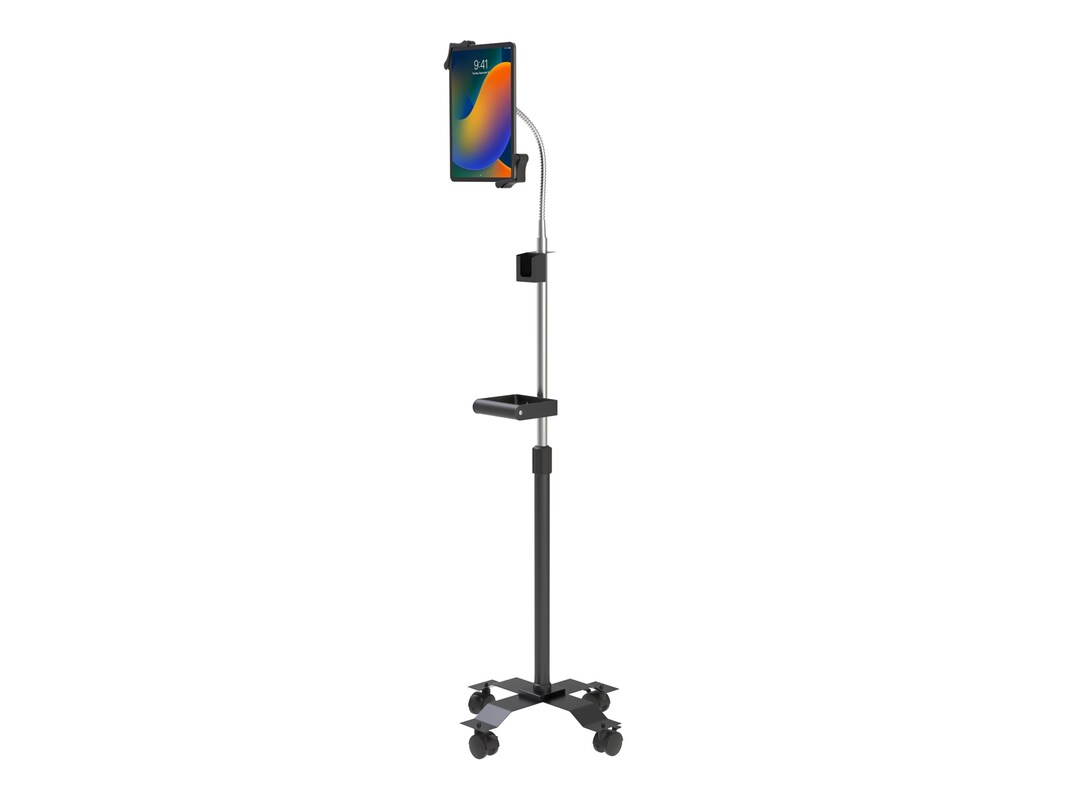Create a mobile, adjustable tablet workstation that moves along with you - with CTA Digital's Compact Gooseneck Floor Stand with Handle. This stand is without equal in adjustability, featuring a powerful, flexible gooseneck and a tilting headpiece with easy 360-degree rotation. Steering your workstation is a breeze with the included handle. Simply choose your desired height, and attach handle with a simple loop clamp. Smooth-rolling swivel casters attach effortlessly to the stand base, giving your stand easy mobility in your office, home, classroom, retail space, or even at the gym. Customize the height-adjusting, telescoping pole. Attach the included storage cradle, which is perfect for an external battery pack or a stack of business cards. The quick-adjusting tablet holder slides open and secures your 7-13-inch tablet by the corners, leaving ports and buttons fully accessible.