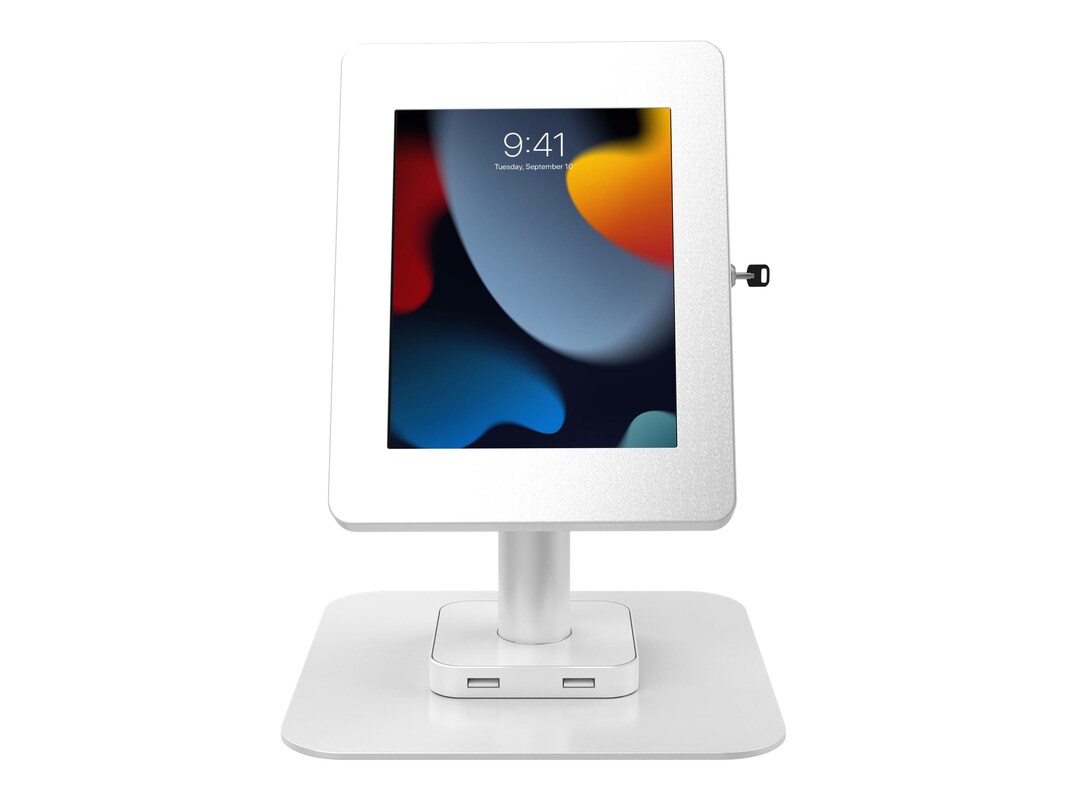 The mounting kit allows for tilt and rotation adjustment for optimal viewing angles, enabling users to switch between portrait and landscape orientations effortlessly. Security is a priority, as indicated by the lockable enclosure that uses a key, ensuring that your tablet remains safe. This versatile solution helps enhance your tablet experience while maintaining a clean and professional appearance.