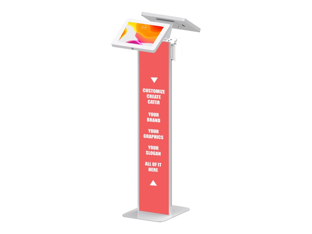 The Premium Locking Floor from CTA Digital makes any office, retail store or grocery store entrance a lot cleaner and safer for its customers. The heavy-duty and secured Dual Enclosure ensemble protects your tablet from theft with a lock and key while simultaneously serving two customers. The enclosure is designed to allow full access to your tablet’s charge ports and front camera while foam pads make the enclosure virtually universal for any 9-11” tablets. The metal bracket strategically placed in between the enclosures is a must have for any business. It fits and keeps in place any of the market’s soap and hand sanitizer’s bottles by using two adjustable Velcro straps. Standing at 48 inches tall, this heavy-duty floor stand is ADA compliant, offers the option for customization through front and back slots and boasts a weighted base equipped with slip and scratch resistant padding.