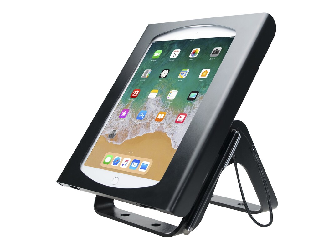 The Lockpoint series from CTA Digital represents the pinnacle of security, style, and functionality. This premium, thick gauge steel enclosure keeps your tablet protected from theft without compromising on accessibility. The case is equipped with a powerful lock and key security system and is designed to allow full access to your tablet's ports, buttons, cameras, and headphone jacks, for card reader compatibility. The case is designed for streamlined transactions, featuring easy front-to-back tilting plus 180-degree rotation for portrait and landscape orientations. The stand mounts easily to your desk, countertop, or other flat surface with a set of included hardware. This kiosk station also includes a stylus and elastic tether, plus a convenient magnetized grip on the stand base. For an optional measure of additional security, a locking steel cable attaches to the Kensington slot on the stand base, attaching at the other end to any permanent fixture.